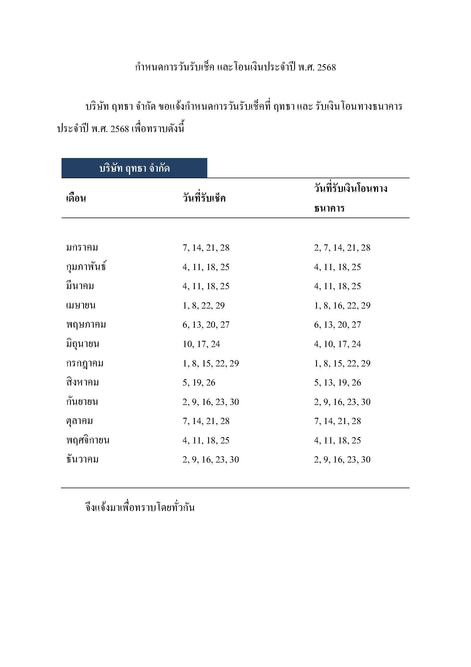 กำหนดการวันรับเช็ค และโอนเงินประจำปี พ.ศ. 2568